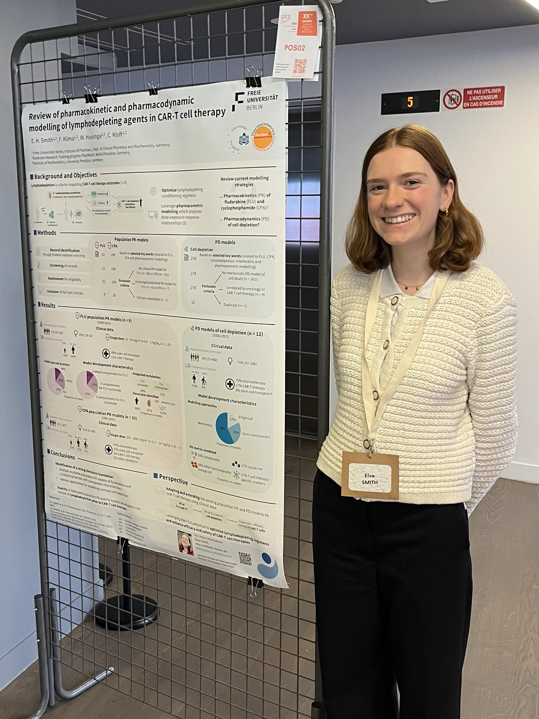 At the conference entitled “Oncopharmacology: from clinical development to therapeutic management” Elsa presented her project “Review of pharmacokinetic and pharmacodynamic modelling of lymphodepleting agents in CAR-T cell therapy”. Her poster presentation was awarded with the “First Poster Prize”. Congratulations on this great success, Elsa!